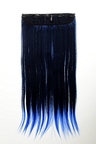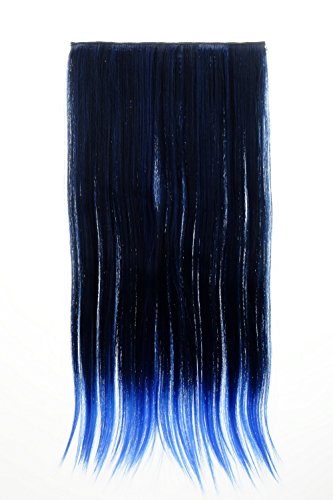 Extension lunga 60 cm, larga 25 cm, con 5 micro clip per l'intera nuca, liscia, in uno stravagante mix di nero velluto e punte blu neon. Fibra sintetica resistente al calore fino a 180°.