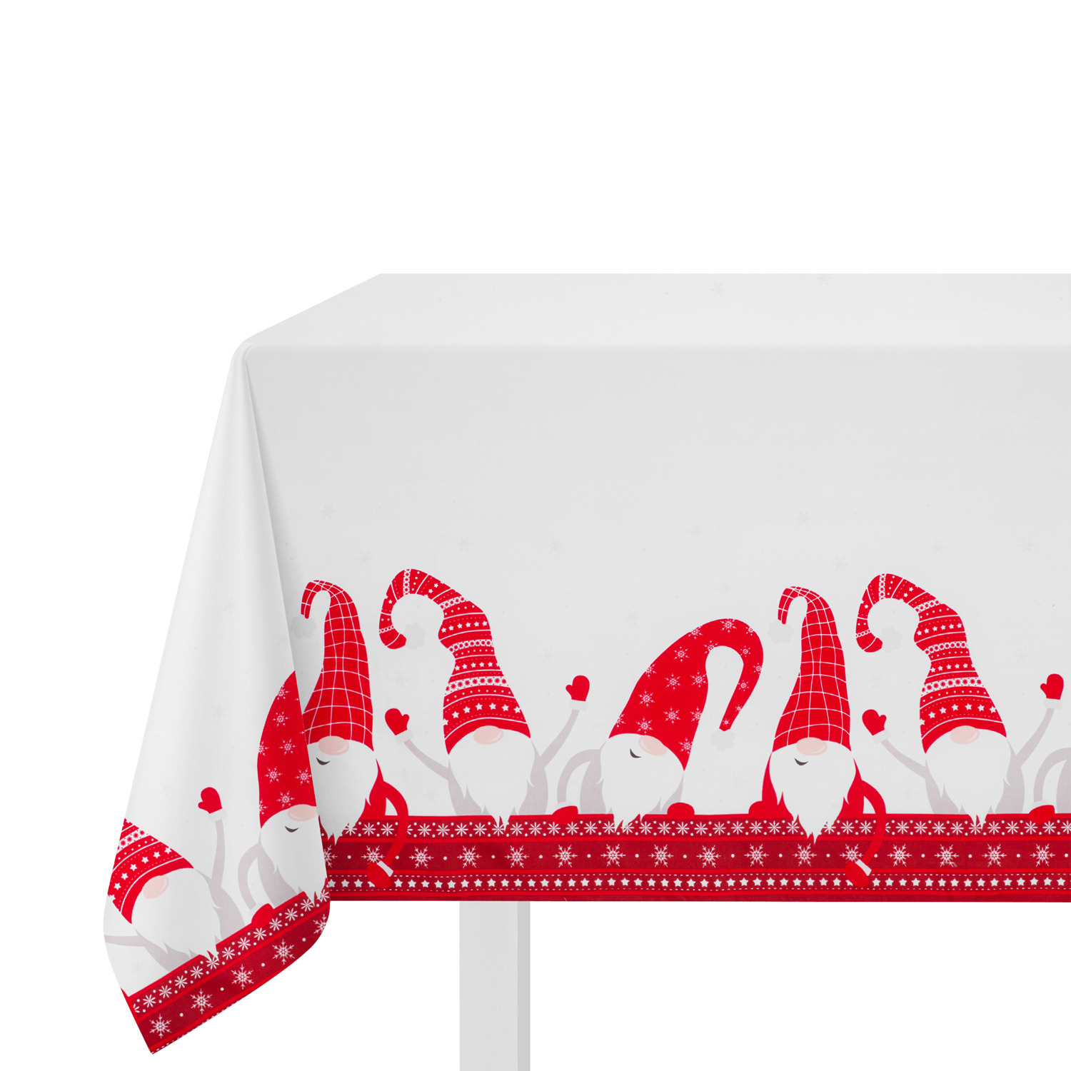 Apparecchia la tua tavola a tema natalizio con questa graziosa tovaglia bianca impreziosita dalla bordatura con simpatici gnomi dal cappello rosso. Accompagnerà con allegria i tuoi momenti a tavola durante le festività di Natale. In più è antimacchia grazie allo speciale tessuto idrorepellente. Con un ciclo in lavatrice a 30° torna come nuova e i colori non sbiadiscono. Le misure 140x180 sono adatte per tavoli da 6 posti.