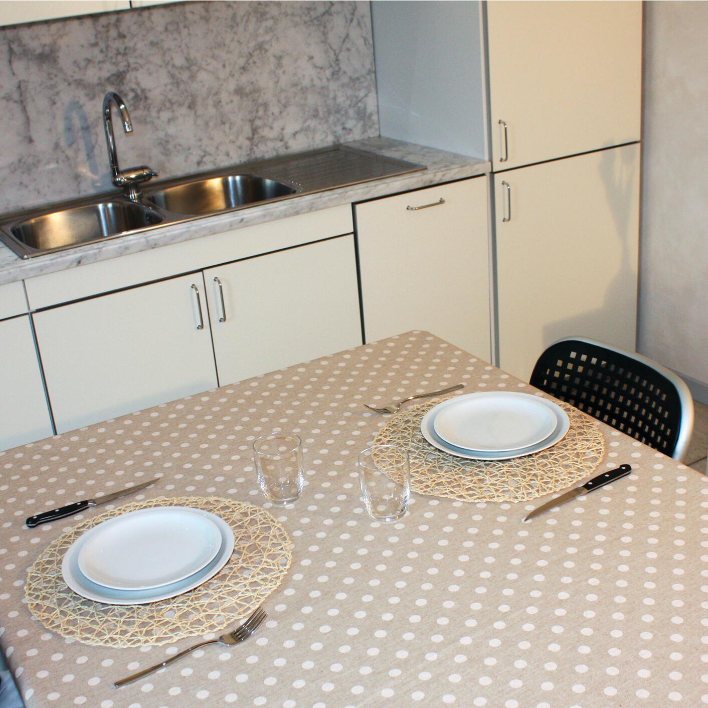In pvc, rettangolare, antimacchia, impermeabile. Indicata per tavoli fino a 8 posti