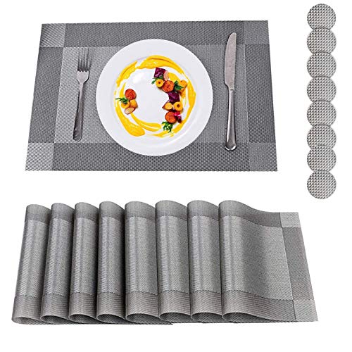 Tovagliette, Set di 8 Tovagliette e Sottobicchieri, Tovagliette Tavola Americana Colazione in PVC Lavabili con Tovagliette Antiscivolo e Sottobicchieri Rotondi per Cucina Hotels Ristoranti (Grigio)