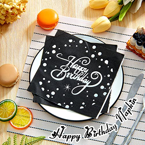 48 Tovaglioli Neri con Happy Birthday Tovaglioli Laminati Tovaglioli Metallici Glitterati per Festa Tovaglioli da Cocktail Decorazioni per Compleanno Anniversario per Tavola (Argento)