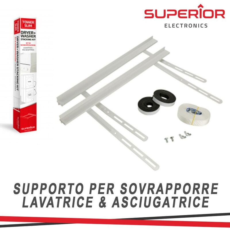Tower Slim - Supporto per sovrapporre lavatrice e asciugatrice.Risparmia spazio consentendo di posizionare l'asciugatrice sopra la lavatrice..Non è richiesto alcun montaggio.Compatibile con tutte le lavatrici e asciugatrici standard o slim a carica frontale, larghezza 60cm, con una profondità massima di 60cm.Facile installazione.Cinghia di sicurezza (6 metri) con fibbia in metallo inclusa.Massimo carico verticale del supporto: 60 kg / 132 lb / 588 N.Larghezza: 60cm.Portata Max ripiano: 8Kg / 17.6lbs.Massima tensione sostenibile dalla cinghia: 200 kg / 440 lb / 1962 NSPECIFICHE::COMPATIBILITÀ= tutte le lavatrici e asciugatrici standard o slim a carica frontale, larghezza 55-66cm, con una profondità massima di 60cm:MASSIMO CARICO VERTICALE DEL SUPPORTO= 100 kg / 220 lb / 980 N:MASSIMA TENSIONE SOSTENIBILE DALLA CINGHIA= 90°:Manuale= Clicca Qui :Scheda tecnica= Clicca Qui
