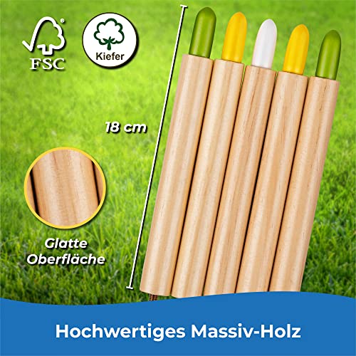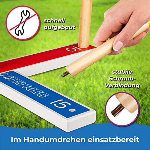 - Con il gioco del lancio degli anelli, robusto e resistente alle intemperie, realizzato in legno di pino certificato FSC, potrai goderti il gioco per molto tempo. Le aste di punta alte 18 cm assicurano una presa stabile e salda dei giochi con il collegamento a vite.