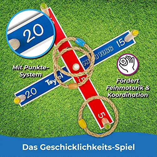 Toyfel gioco di lancio degli anelli Mitty Toss - all'aperto e al chiuso, 15 anelli (10x plastica e 5x anelli di corda) - gioco per bambini e adulti, gioco di lancio in legno di FSC® pino per famiglie