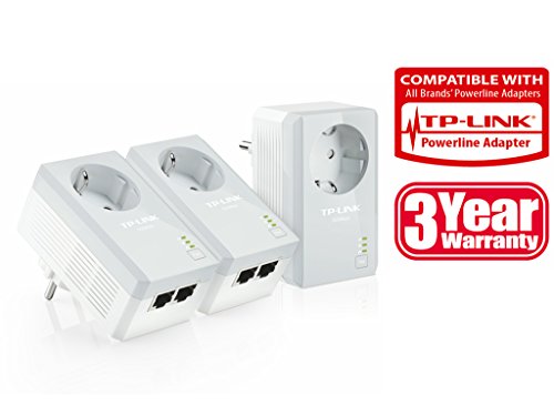 TP-LINK TL-PA4020PT KIT Trio Powerline AV500 con presa passante, 2 porte Ethernet, fino a 500Mbps e 300 metri di copertura, Plug&Play, Kit con 3 adattatori