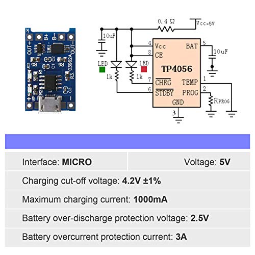 Chip di ricarica TP4056, con interfaccia Micro USB, utilizzato per la batteria al litio 18650.