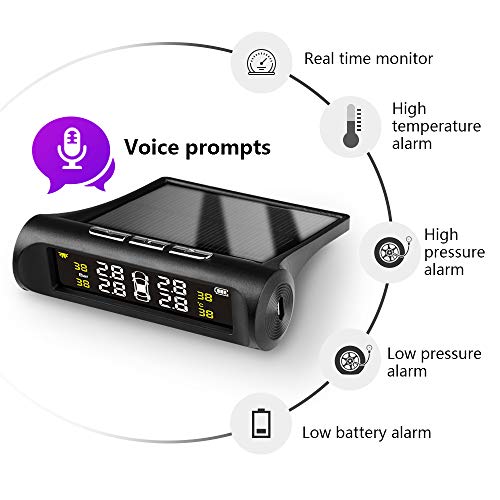 ►Allarme vocale intelligente - Il più recente sistema di monitoraggio della pressione dei pneumatici ha un avviso vocale per allarme di perdita rapida, allarme di perdita lenta, allarme di alta pressione, allarme di alta temperatura, allarme di guasto del sensore e allarme di bassa potenza della batteria del sensore, per garantire una guida sicura.