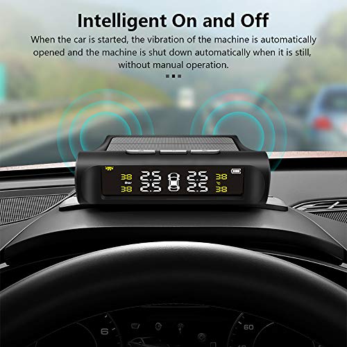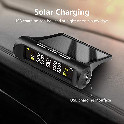 ►Solar power e USB ricaricabile - Il monitoraggio per tutte le condizioni atmosferiche, la pressione dei pneumatici può essere caricata dal solare durante la giornata di sole, il sistema di monitoraggio della pressione dei pneumatici può anche essere caricato tramite cavo USB quando è piovoso il giorno nuvoloso. Il manometro per pneumatici è davvero conveniente e consente di risparmiare energia.