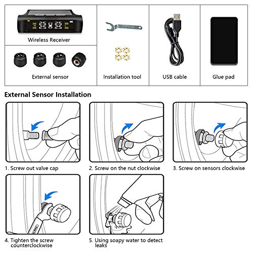 ►4 Sensori esterni - I sensori del sistema di monitoraggio della pressione dei pneumatici sono impermeabili e completamente qualificati per i giorni di pioggia e presentano anticorrosivi per il servizio a vita.