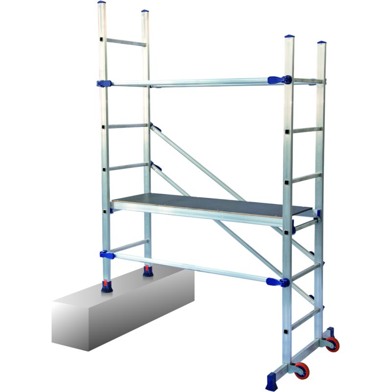 Trabattello domestico con struttura in alluminio - pianale di lavoro in legno - 4 ganci di sicurezza sul pianale - barra stabilizzatrice con ruote inattive da un lato - otturatori rigidi ad accogliere due flange in resina morbida a protezione di pavimenti