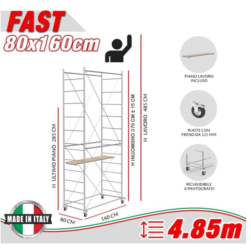L' acquisto comprende 1 base 160x80 cm (ingombro) 2 campate h 175 cm (4 spalle + 4 correnti + 8 diagonali) 1 semipiano in betulla (160x30 cm) 4 ruote girevoli in gomma nera corredate di freno da 125 mm Per l'utilizzo semiprofessionale e per il fai da te. Trabattello in acciaio zincato elettrolitico. Facilissimo da montare e smontare. Smontando l'asta laterale può passare attraverso porte e corridoi. Maneggevole grazie alle sue campate da 175 cm. Poco ingombrante, leggero e sicuro. Corredato di 4 ruote diametro 125 mm. I tiranti diagonali sono facilmente applicabili su appositi bussolotti alettati senza alcun uso di viti e bulloni. Completo di certificato di conformità. Clicca qui e scopri cos'è la zincatura elettrolitica, come funziona e come protegge i trabattelli in acciaio Principali altezze Altezza ingombro Ultimo piano Lavoro con operatore 3,75 m 2,85 m 4,85 m Sfilando l'apposita asta alla base, è possibile richiudere il trabattello perché occupi il minimo spazio e per farlo