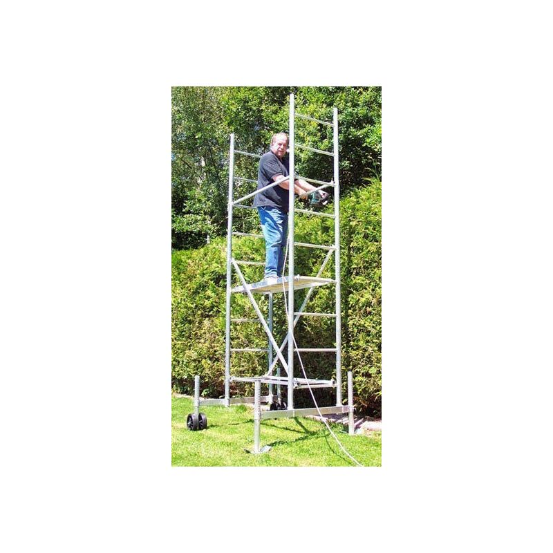 USO - Materiale per tagliare le aiuole, tagliare rami, cime di alberi... - Spostamento facilitato grazie alle 2 ruote indistruttibili Ø 260mm. VANTAGGI - Materiale che riduce i rischi di caduta di alberi. - Evita di aggrapparsi agli alberi durante il lavoro o fare acrobazie pericolose per raggiungere le cime. - Alternativa al alvoro in sospensione su corde. - Comodità dei movimenti, meno fatica o rischio di incidenti e scivolate. - Sicurezza e velocità di esecuzione del lavoro. - Permette di usare il materiale per tagliare in modo più preciso e sicuro. CARATTERISTICHE - Struttura in alluminio con piano in alluminio/legno regolabile ogni 0.25m. - Montanti Ø 50mm. - Dimensioni botola nel piano di calpestio: 0.40 x 0.60m - Piedi regolabili su 30 cm per adattarsi a ogni tipo di suolo, anche sui terreni più irregolari - Montaggio facile da una sola persona: libretto delle istruzzioni fornito con il materiale. - Trabattello da giardino con 2 stabilizzatori a partire da 4.00m di altezza del