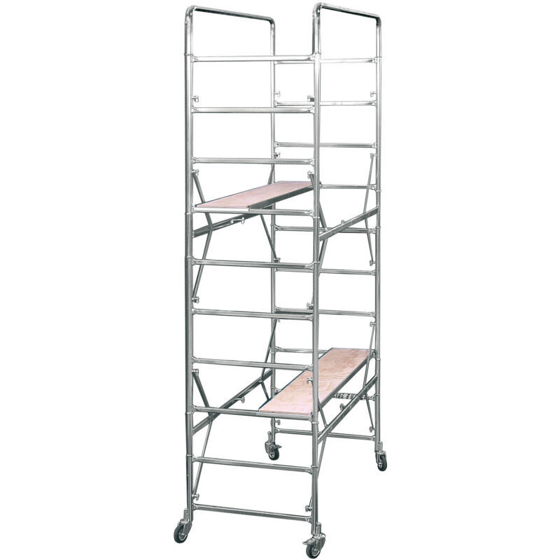 In acciaio zincato Per lavori professionali e il Fai da Te Montaggio veloce, sganciando le aste si può schiacciare per il passaggio attraverso porte e lungo il corridoio minimo ingombro dotato di due ruote con freno per facilitare gli spostamenti doppio piano di lavoro Montanti in tubo acciaio Ø 30 mm Dimensioni 165x75 cm altezza max 300 cm Portata Kg. 120