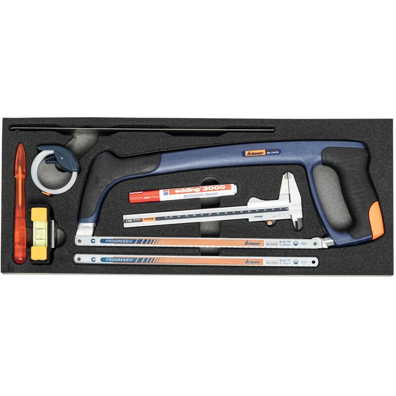 Assortimenti standard di utensili in alloggiamenti in espanso rigido bicolore in PE. La struttura non porosa dell'espanso è impermeabile e resistente agli oli. Strato superiore color antracite, quello inferiore di contrasto color grigio mette in evidenza gli utensili mancanti. Fornitura: Inserto in espanso rigido vuoto n. art. 952001 Dim. 954890: 1 pz. Evidenziatore permanente EDDING n. art. 085130 Dim. R: 1 pz. Calibro a corsoio GARANT n. art. 410100 Dim. 150: 1 pz. Punta a tracciare in metallo duro n. art. 458760 Dim. HM: 1 pz. Riga flessibile di precisione in acciaio HOLEX n. art. 461600 Dim. 300: 1 pz. Nastro in acciaio GARANT n. art. 461992 Dim. 3: 1 pz. Livella a bolla tascabile n. art. 467482 Dim. 70: 1 pz. Seghetto per metallo GARANT n. art. 580400: 1 pz. Lama per sega manuale GARANT n. art. 582500 (1 confezione = 10 pezzi): 1 pz. Dati tecnici Riempimento di un cassetto in G 8×20 Forma in espanso rigido LD45, spessore mm 30 Tipo di prodotto Inserto in espanso rigido Larghezza