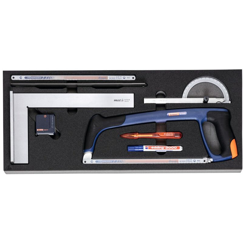 Assortimenti standard di utensili in alloggiamenti in espanso rigido bicolore in PE. La struttura non porosa dell'espanso è impermeabile e resistente agli oli. Strato superiore color antracite, quello inferiore di contrasto color grigio mette in evidenza gli utensili mancanti. Fornitura: Inserto in espanso rigido vuoto n. art. 952001 Dim. 954987: 1 pz. Evidenziatore permanente EDDING n. art. 085130 Dim. B: 1 pz. Squadra a cappello HOLEX art. 452600 Dim. 300×175: 1 pz. Goniometro HOLEX n. art. 453000 Dim. 120×150: 1 pz. Punta a tracciare PB in metallo duro n. art. 458760: 1 pz. Riga flessibile di precisione in acciaio HOLEX n. art. 461600 Dim. 300: 1 pz. Flessometro n. art. 462201 Dim. 2,5: 1 pz. Seghetto per metallo GARANT n. art. 580400: 1 pz. Lama per sega manuale GARANT n. art. 582500 (1 confezione = 10 pezzi): 1 pz. Dati tecnici Riempimento di un cassetto in G 10×24 Forma in espanso rigido LD45, spessore mm 30 Tipo di prodotto Inserto in espanso rigido Larghezza in G 10