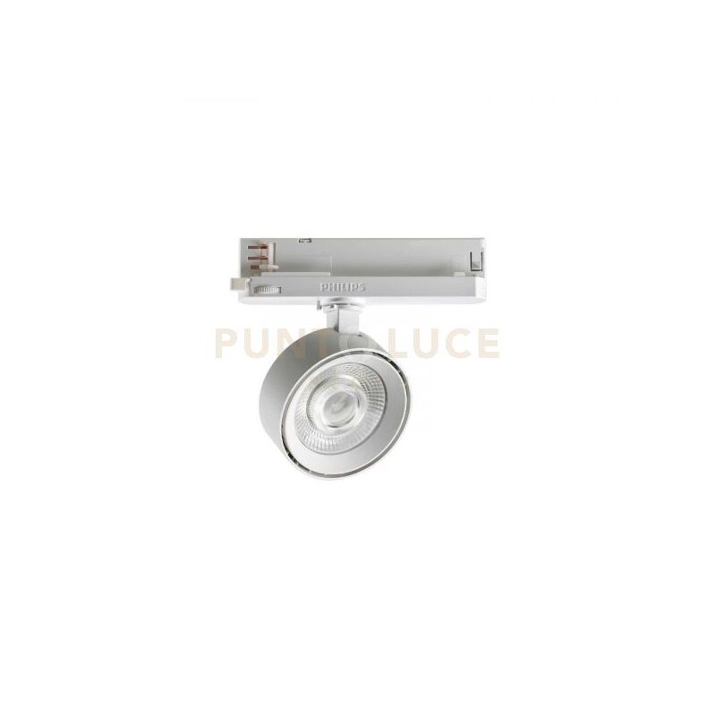 Proiettore cilindrico in alluminio estruso con ottica simmetrica e fascio di apertura variabile da stretto ad ampio (20°-55°),adatto per installazione su binario trifase.