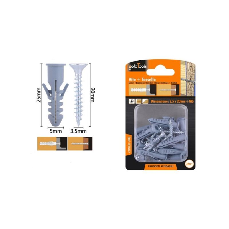 Set 28 pezzi tasselli M5 con viti ø 3.5x20 mmfissaggio con collare con corpo del tassello aperto e linguette antirotazione. L'espansione necessaria alla resistenza alla trazione avviene per avvitamento della apposita vite autofilettante e su due direzioni che permette, con espansioni parallele alla linea del bordo, di fissare carichi anche in prossimità degli spigoli. Il tassello, per la sua geometria, si fissa in profondità nel supporto e la presenza del collarino impedisce al tassello stesso di penetrare nel foro. Le sue alette laterali non gli permettono di ruotare sul proprio asse.Misure vite 3.5x20mm tassello M5 5x25mm