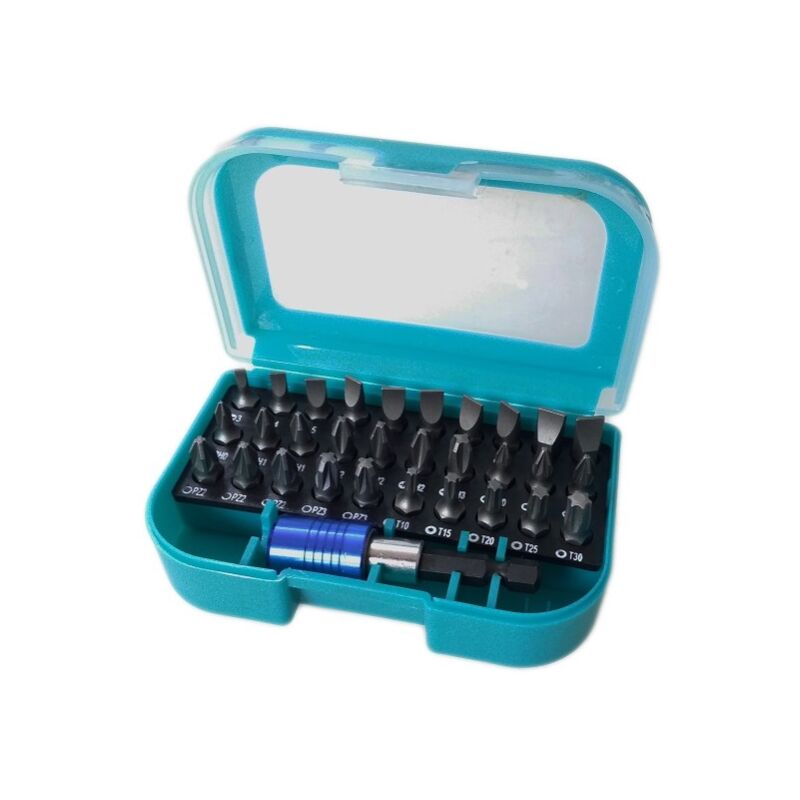 Pratica confezione di 31 pz composta da ben 30 inserti e una prolunga.Ideale per cacciaviti ad innesto rapido o anche per piccoli avvitatore a batteria.Contenuto del kit:1 -31 -42 -54 -62 -71 PH02 ph13 ph21 ph31 PZ02 pz13 pz22 pz31 t101 t151 t201 t251 t301 Porta inserti