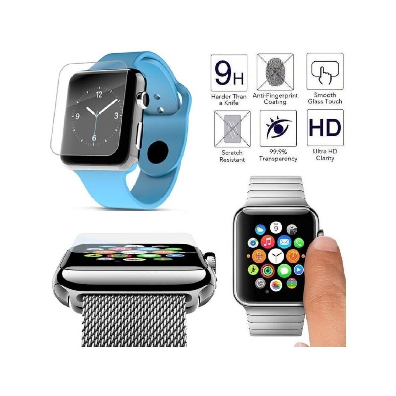 Protegge l'iWatch da graffi e abrasioni. Distribuisce un eventuale colpo su tutta la superficie anzichè soltanto sul punto dov'è stato colpito. La pellicola è composta da tre strati: 1. Micro strato oleofobico. 2. Micro strato in vetro temperato. 3. Pellicola protettiva contro la frantumazione del vetro. 4. Micro strato adesivo trasparente. 5. Micro strato in silicone contro le bolle d'aria. Questa sottilissima pellicola estremamente resistente offre una perfetta protezione da oggetti affilati graffi, sporco, impronte e polvere. Il vostro iWatch rimarrà ben protetto e nuovo come il primo giorno. Vetro resistente: nel caso in cui il vetro si rompa la superficie si crepa in micro crepe interne senza creare pericolosi angoli taglienti. La pellicola è inoltre idrorepellente. Semplici da applicare grazie anche al panno dato in dotazione per pulire il tablet.Ogni confezione è composta da:- 1 Pellicola Fronte in vetro temperato;