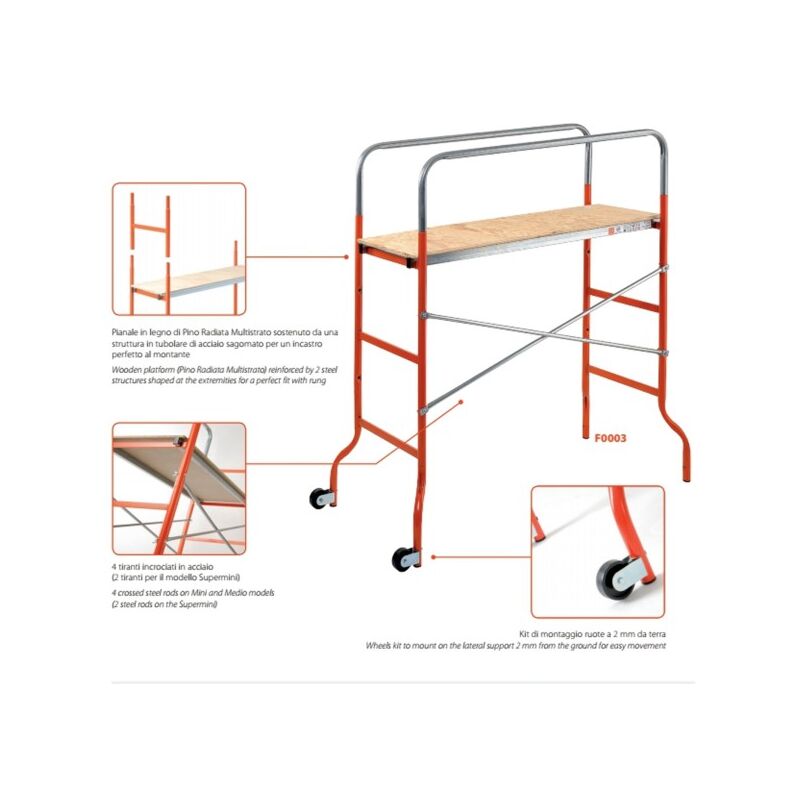 Trabattello in acciaio verniciato con pianale rinforzato, adatto per tutti i lavori di bricolage e faidate in casa o all'esterno. Robusto e stabile, grazie alla sua base allargata si può spostare facilmente sulle ruote.CARATTERISTICHE COD. F0015PIANALE in legno di Pino Radiata Multistrato sostenuto da una struttura in tubolare di acciaio sagomato per un incastro perfetto al montanteBASE allargata per garantire grande stabilità in fase di utilizzoKIT di montaggio ruote a 2 mm da terra4 TIRANTI incrociati in acciaio (2 tiranti per il modello Supermini)Portata massima garantita 120 kgConforme al D.Lgs. 81/08