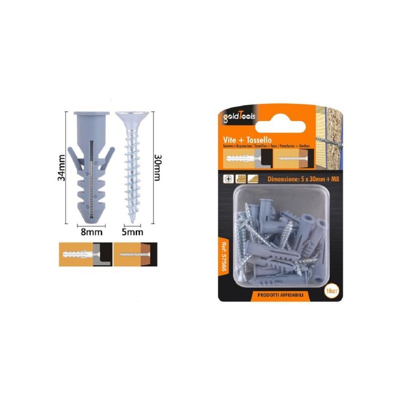 Set 10 pezzi tasselli M8 con viti ø 5x30mmfissaggio con collare con corpo del tassello aperto e linguette antirotazione. L'espansione necessaria alla resistenza alla trazione avviene per avvitamento della apposita vite autofilettante e su due direzioni che permette, con espansioni parallele alla linea del bordo, di fissare carichi anche in prossimità degli spigoli. Il tassello, per la sua geometria, si fissa in profondità nel supporto e la presenza del collarino impedisce al tassello stesso di penetrare nel foro. Le sue alette laterali non gli permettono di ruotare sul proprio asse.Misure vite 5x30mm tassello M8 8x34mm