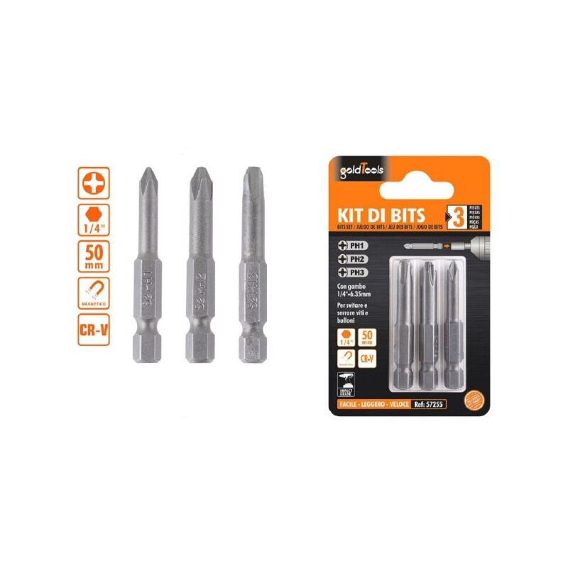 KIT DI BITS 3PZ BIT INSERTI PER AVVITATORE 50MM PH1/2/3 GAMBO 1/4-6.35MM 57255Il kit di bits da 3 pezzi è un'aggiunta essenziale per qualsiasi set di attrezzi, progettato per migliorare l'efficienza e la precisione durante le attività di avvitatura e svitatura. Questo set include bits con le dimensioni PH1, PH2 e PH3, fornendo la flessibilità necessaria per adattarsi a una varietà di viti e bulloni.Ogni bit ha una lunghezza di 50 mm, ideale per raggiungere anche le aree più profonde e difficili da raggiungere. Il gambo da 1/4 (6.35 mm) si adatta perfettamente alla maggior parte degli avvitatori elettrici e strumenti manuali, garantendo una connessione sicura e stabile durante l'uso.Realizzati in lega di cromo-vanadio (CR-V), questi bits offrono una resistenza superiore all'usura e alla corrosione, assicurando una durata prolungata anche con un uso frequente. Il design magnetico dei bits permette di mantenere le viti e i bulloni saldamente in posizione durante l'avvitatura e lo