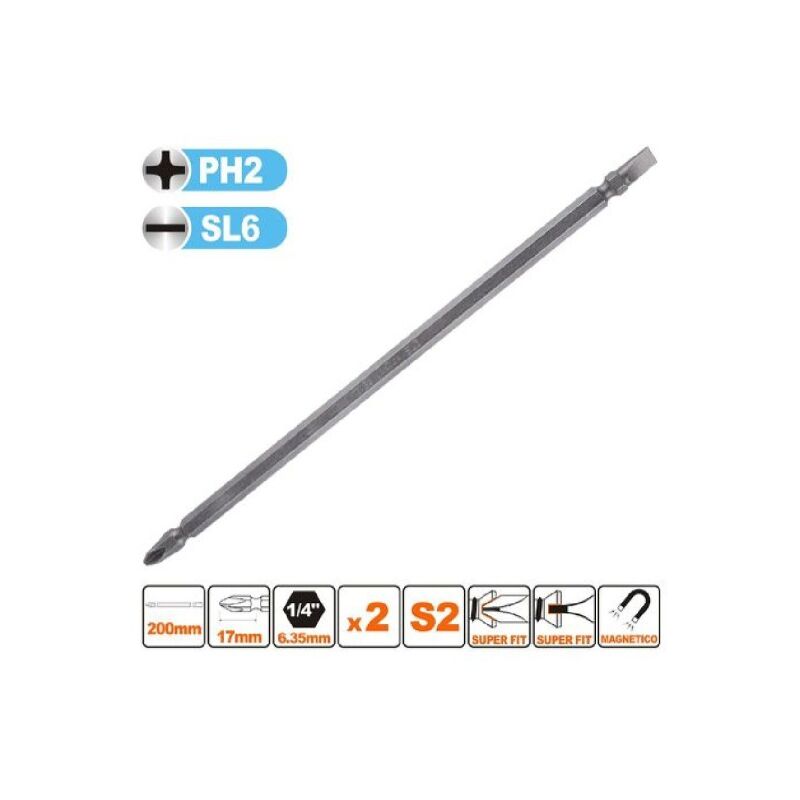 Kit di bits 2 pezziPunte inserti ph2 punte s2 e sl6 da 200mm.Ogni pezzo è munito di 2 diverse punte alle due estremità, da un lato la classica punta a croce e dall'altra parte la punta a taglio o piatta.Superfice con finitura satinataI bit lunghi 200mm sono perfettamente adatti anche per raggiungere viti più profondeBasta capovolgere il bit nella macchina e si è pronti per l'avvitamento successivoMateriale: s2 acciaioManico esagonale diametro: 6.35mm (1/4)Lunghezza: 200mmTipo di testa: croce PH2 + taglio SL6