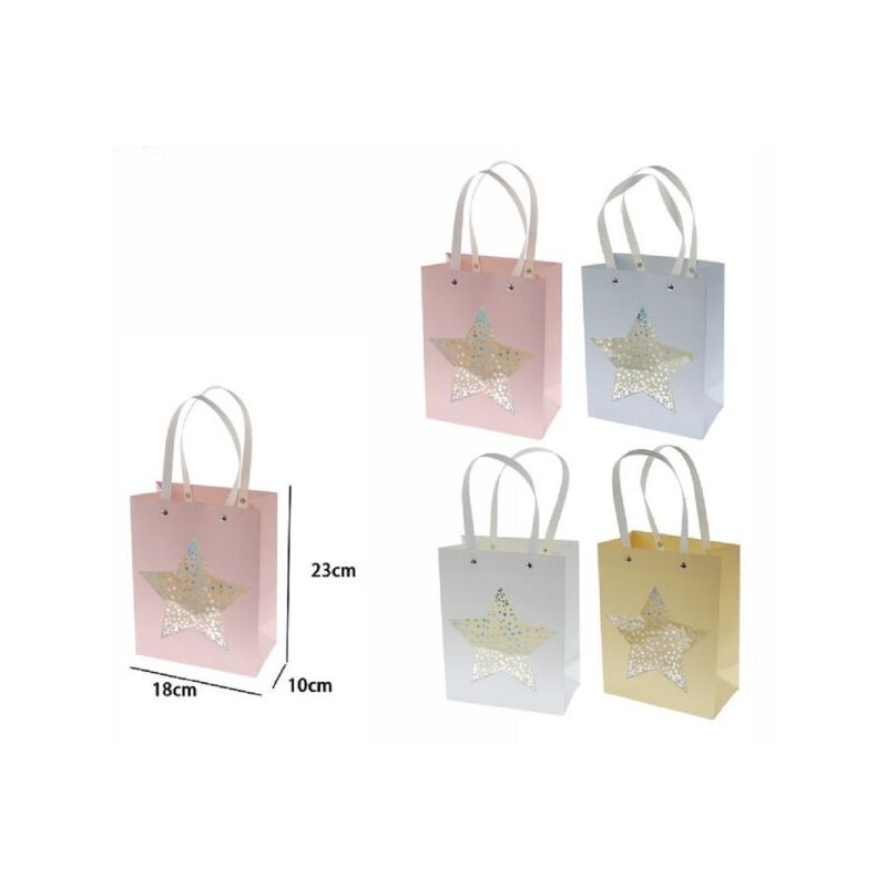 Set 2 Pz Buste Borsa da Regalo con Stella 23 x 18 x 10cm 69938 Varie ColorazioniLe buste borsa da regalo sono un modo elegante per presentare i tuoi doni in occasioni speciali. Con il nostro set di 2 pezzi, avrai tutto il necessario per impreziosire i tuoi regali. Disponibili in varie colorazioni, queste buste aggiungono un tocco di raffinatezza e stile al tuo dono.Caratteristiche Principali:Set da 2 Pz: Questo set include due buste borsa da regalo, ideali per regali di diverse dimensioni o per occasioni multiple.Design Con Stella: Ogni busta è decorata con una graziosa stella, che aggiunge un tocco di festività e gioia al tuo regalo.Misure Generose: Con dimensioni di 23 x 18 x 10cm, le nostre buste sono sufficientemente spaziose per contenere una vasta gamma di regali.Varie Colorazioni: Scegli tra una gamma di colori disponibili per trovare quello che si abbina perfettamente al tuo dono o all'occasione.Contenuto della Confezione:2 buste borsa da regalo con stella (colore