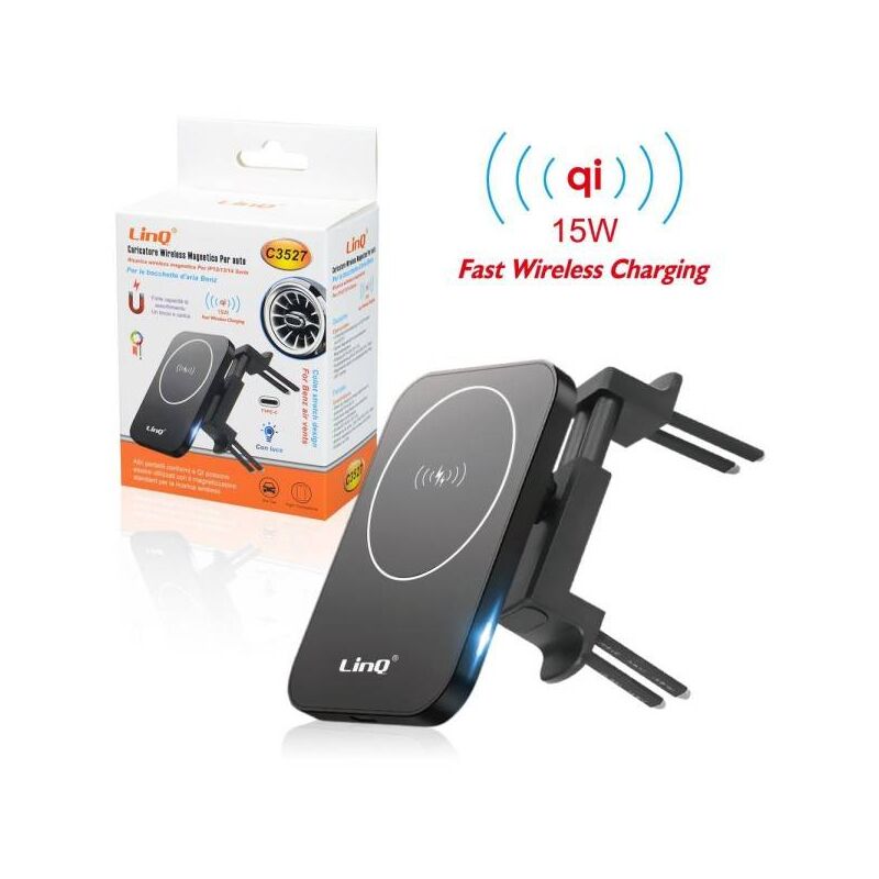 CARICABATTERIA WIRELESS AUTO QI 15W SMARTPHONE PRESA ARIA MERCEDES BENZ LUCE C3527Il nostro Caricabatteria Wireless per Auto Qi da 15W è la soluzione ideale per ricaricare il tuo smartphone mentre sei in viaggio, mantenendo la massima comodità e stile, perfettamente integrato nelle bocchette dell'aria della tua Mercedes Benz.Caratteristiche Principali:Potenza di Ricarica: 15W, garantendo una ricarica rapida e efficiente per il tuo smartphone.Compatibilità Qi: Certificato per funzionare con tutti gli smartphone dotati di tecnologia di ricarica wireless Qi.Integrazione Mercedes Benz: Progettato appositamente per adattarsi alle bocchette dell'aria della tua Mercedes, mantenendo l'estetica e la funzionalità del tuo veicolo.Luce LED C3527: Dotato di una luce LED discreta e moderna, che aggiunge un tocco di eleganza e facilità d'uso durante la ricarica.Contenuto della Confezione:Caricabatteria Wireless Auto Qi 15WManuale dell'utenteCavo di AlimentazioneScopri la praticità di ricaricare il