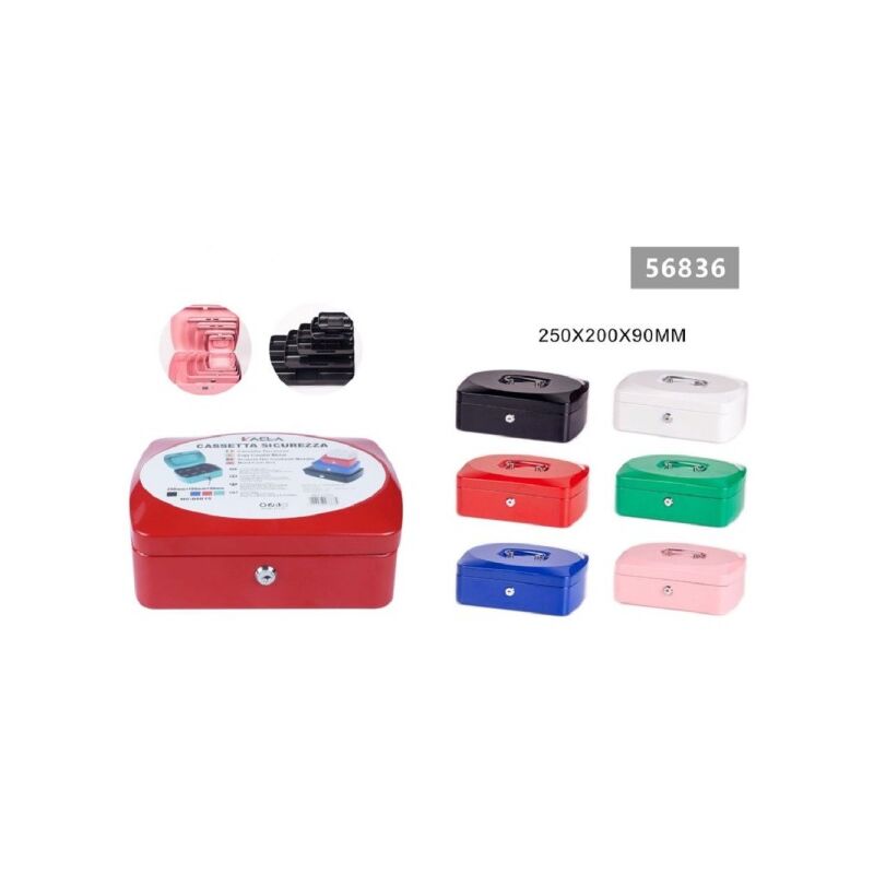 Cassetta portavalori con serratura Cassetta portavalori con vassoio estraibile con divisorio portamonete utile per poter tenere sempre in ordine le monete e tenere nascosto sotto allo scomparto gli oggetti di valore. Dispone di una doppia chiave per aprire la cassaforte e di un manico per un trasporto pratico.Scomparto interno estraibile con divisorio portamoneteDoppia chiave e manico per un facile trasportoDimensione: 25x19x9 cmIl colore può variare in base alla disponibilità del magazzino.