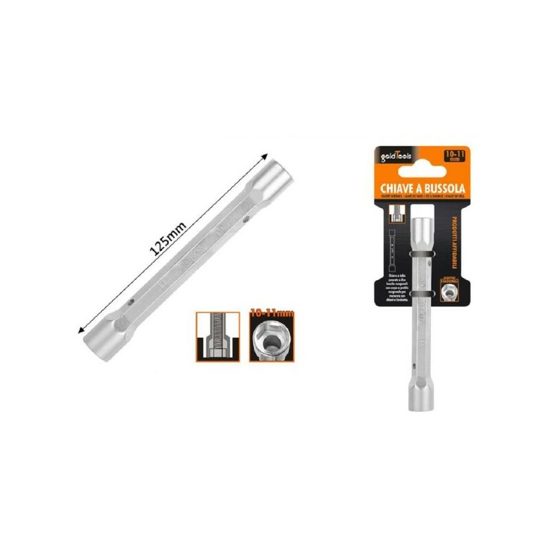 Chiave a tubo pesante a due bocche esagonali con corpo a profilo esagonale per manovra con chiavi a forchetta.Lunghezza totale 125 mm Per assemblaggi particolarmente pesantiDa utilizzare con chiave a forchettaCorpo esagonaleForma della chiave a due lati esagonali da 10-11 mmTipo di prodotto chiavi a tubo