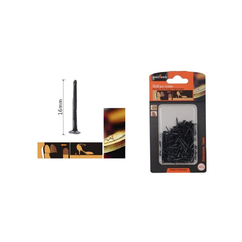 SET CONFEZIONE 60GR CHIODI PER SCARPE 16 MM NERI PER RIPARAZIONI CALZOLAIO 90888Le puntine chiodi neri per scarpe sono fondamentali per effettuare riparazioni durature e di qualità su mobili per calzolai. Con una lunghezza di 16mm, questi chiodi per scarpe sono progettati per offrire un'elevata resistenza alla trazione, garantendo una durata eccezionale anche nelle condizioni più avverse.Caratteristiche Principali:Resistenza alla trazione: I chiodi per scarpe sono realizzati con materiali di alta qualità che garantiscono una resistenza superiore alla trazione, assicurando che le riparazioni siano robuste e affidabili nel tempo.Durata: Grazie alla loro costruzione robusta, questi chiodi per scarpe offrono una durata eccezionale, garantendo che le riparazioni rimangano solide e stabili nel tempo.Resistenza alle condizioni avverse: Progettati per resistere anche alle condizioni più difficili, questi chiodi per scarpe sono ideali per essere utilizzati in ambienti dove sono richieste