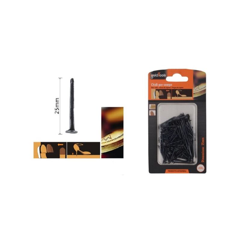 SET CONFEZIONE 60 GR CHIODI PER SCARPE 25MM NERI PER RIPARAZIONI CALZOLAIO 90891Le puntine chiodi neri per scarpe da calzolaio sono un componente essenziale per garantire riparazioni durature e affidabili ai tuoi amati calzari. Con una lunghezza di 25mm, questi chiodi sono progettati per resistere alle sollecitazioni quotidiane e mantenere saldamente in posizione i vari strati di materiale che compongono le scarpe.Caratteristiche Principali:Resistenza alla Trazione: I chiodi per scarpe presentano un'elevata resistenza alla trazione, assicurando che le riparazioni siano robuste e durevoli nel tempo.Durabilità: Realizzati con materiali di alta qualità, questi chiodi sono progettati per durare nel tempo, resistendo all'usura e all'abrasione quotidiana.Adattabilità: Con una lunghezza di 25mm, sono adatti per una vasta gamma di riparazioni e lavori di calzoleria, garantendo una flessibilità d'uso ottimale.La confezione da 60 grammi offre una quantità generosa di chiodi, permettendoti di