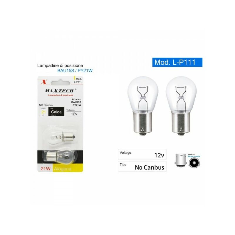 Lampadine BAU15S L-P111 12V 21WLampadine di posizione PY21W con base BAU15S e 21 Watt di potenza compatibile con i veicoli dotati di impianto elettrico da 12 Volts. Ideate per essere utilizzate per le luci di posizione. Coppia di lampadine per auto PY21W- BAU15S. Voltaggio: 12V Potenza: 21W Attacco: BAU15S (contatto semplice) Modello: PY21W Luce CALDA Alogena No Canbus Confezione Da 2 PezziIL PACCO INCLUDE: 2 Lampadine PY21W BAU15S