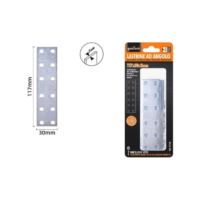SET 4 PZ LASTRINE LASTRINA PIASTRA DI GIUNZIONE 117X30X2MM CON VITI MOBILI 57140La lastrina staffa piastra 117x30x2mm è un componente essenziale per il fissaggio di mensole, ripiani o mobili. Con i suoi 12 fori per il fissaggio tramite viti, offre una solida base per il rinforzo di sedie, mobili e per vari utilizzi hobbystici.Caratteristiche principali:Materiale resistente: Realizzata con materiali di alta qualità, questa lastrina assicura una durata e una robustezza eccezionali.Dimensioni ideali: Le dimensioni di 117x30x2 mm la rendono adatta per una vasta gamma di progetti e applicazioni.12 fori per il fissaggio: I numerosi fori presenti consentono un fissaggio sicuro e stabile, garantendo la massima sicurezza.Contenuto della confezione:Quantità: Set da 4 lastrine.Dimensioni: 117x30x2 mm.I set di lastrine lastre piastra di giunzione 117x30x2mm con viti mobili 57140 offrono la soluzione perfetta per tutti i tuoi progetti di fissaggio e rinforzo. Sia che tu stia lavorando su mobili