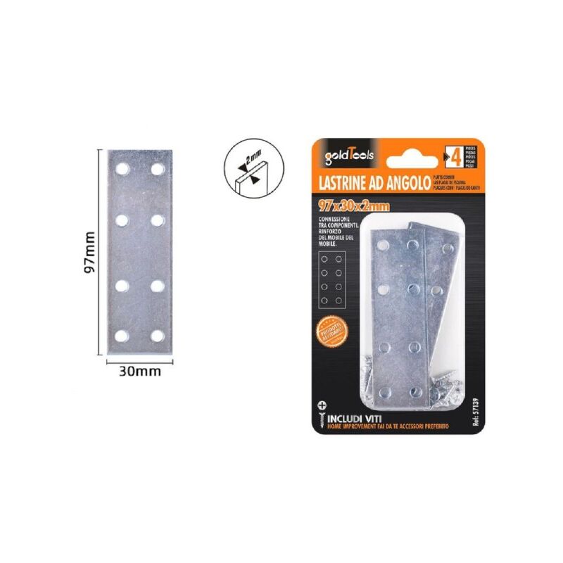 SET 4PZ LASTRINE LASTRINA PIASTRA DI GIUNZIONE 97X30X2MM CON VITI MOBILI 57139La lastrina staffa piastra di dimensioni 97x30x2mm è un componente essenziale per il fissaggio di mensole, ripiani o mobili. Dotata di 8 fori per il fissaggio tramite viti, offre una solida base per il rinforzo di sedie, mobili e per vari utilizzi hobbystici.Caratteristiche principali:Lastrina di dimensioni 97x30x2mmIdeale per fissaggio di mensole, ripiani o mobiliDotata di 8 fori per il fissaggio tramite vitiUtilizzo versatile per rinforzo di sedie, mobili e progetti hobbysticiContenuto della confezione:Quantità: 4 lastrineDimensioni: 97x30x2 mmLe lastrine staffa sono essenziali per garantire la stabilità e la resistenza dei tuoi progetti fai-da-te. Confezionate in set da 4 pezzi, sono pronte per essere utilizzate in una vasta gamma di applicazioni, dall'arredamento domestico alle creazioni hobbystiche. Rendono il processo di montaggio rapido e semplice, offrendo una soluzione affidabile per i tuoi progetti