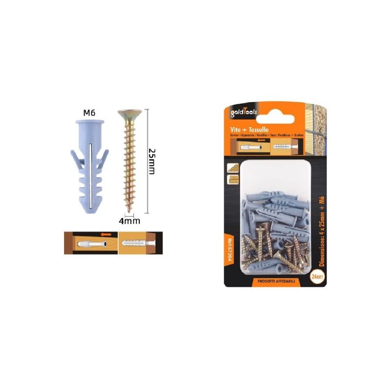 SET 24 PEZZI TASSELLI M6 CON VITI Ø 4x25 mmFissaggio con collare con corpo del tassello aperto e linguette antirotazione. L'espansione necessaria alla resistenza alla trazione avviene per avvitamento della apposita vite autofilettante e su due direzioni che permette, con espansioni parallele alla linea del bordo, di fissare carichi anche in prossimità degli spigoli. Il tassello, per la sua geometria, si fissa in profondità nel supporto e la presenza del collarino impedisce al tassello stesso di penetrare nel foro. Le sue alette laterali non gli permettono di ruotare sul proprio asse.Misurevite 4x25mmtassello M6