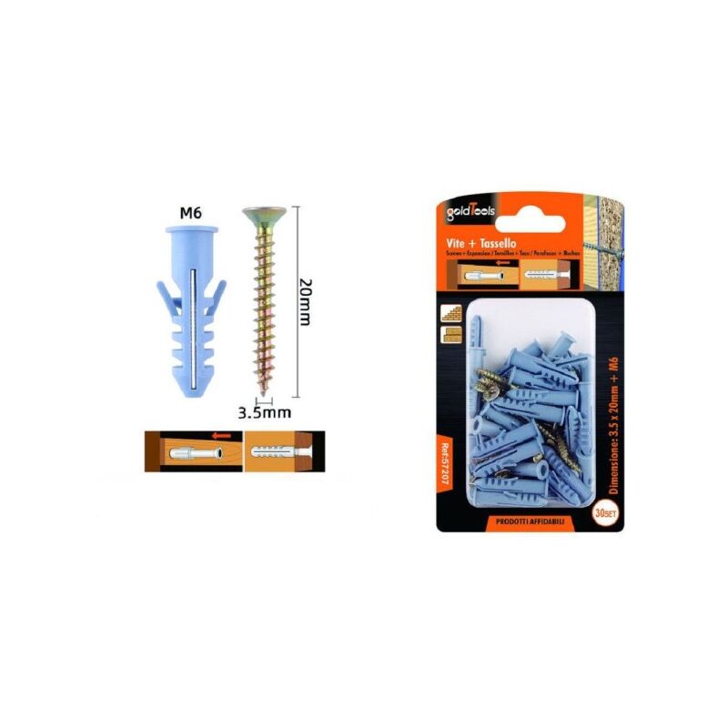 SET 30 PEZZI TASSELLI M6 CON VITI Ø 3.5x20mmFissaggio con collare con corpo del tassello aperto e linguette antirotazione. L'espansione necessaria alla resistenza alla trazione avviene per avvitamento della apposita vite autofilettante e su due direzioni che permette, con espansioni parallele alla linea del bordo, di fissare carichi anche in prossimità degli spigoli. Il tassello, per la sua geometria, si fissa in profondità nel supporto e la presenza del collarino impedisce al tassello stesso di penetrare nel foro. Le sue alette laterali non gli permettono di ruotare sul proprio asse.Misurevite 3.5x20mmtassello M6