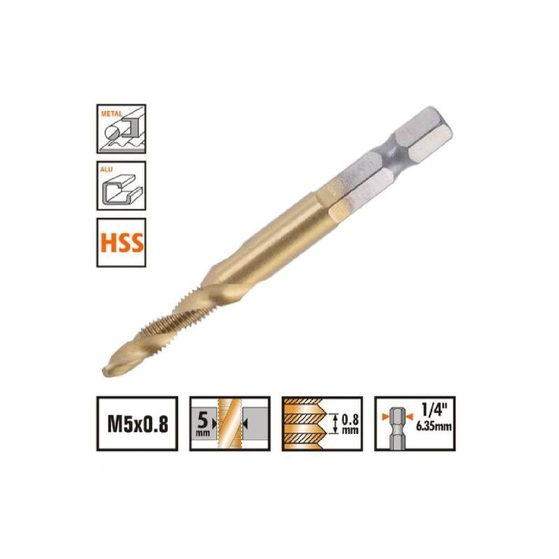Punta per Trapano M5x0.8mm in Titanio HSS con Filettatura Metrica Metallo 57211La punta per trapano M5x0.8 è un'opzione affidabile e versatile per soddisfare le esigenze di perforazione più esigenti. Caratterizzata da una filettatura metrica in metallo, questa punta offre prestazioni superiori e durature per una vasta gamma di applicazioni.Caratteristiche Principali:Punta rivestita in titanio: La rivestitura in titanio conferisce alla punta una maggiore resistenza all'usura e alla corrosione, prolungando la durata della punta e garantendo prestazioni costanti nel tempo.Materiale realizzato in HSS: Realizzata in acciaio ad alta velocità (HSS), questa punta garantisce una durezza eccezionale e una resistenza al calore superiore, consentendo di perforare con precisione e facilità anche i materiali più resistenti.Adatte per forare su metallo tenero, lamiere di alluminio, ferro, ecc.: Grazie alla sua robustezza e alla capacità di taglio efficace, questa punta è ideale per una vasta gamma