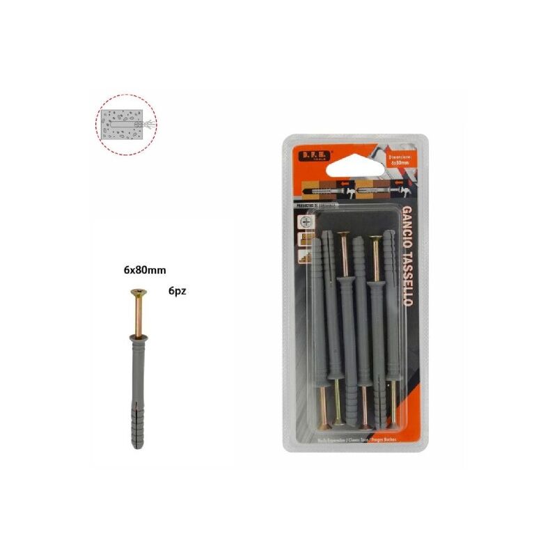 SET 6 PZ TASSELLI FISHER VITI VITE CHIODI GANCIO TASSELLO MISURA 6 X 80 MM 69051Il Set 6 Pz Gancio Tassello offre una soluzione versatile e affidabile per il montaggio superficiale di una vasta gamma di elementi, dalla carpenteria ai listelli decorativi. Ogni tassello è dotato di una vite con intaglio a croce premontata, che semplifica il processo di installazione su legno e mattoni.Caratteristiche principali:Tassello con Vite Integrata: Ogni tassello è fornito con una vite già inserita, garantendo una rapida installazione senza la necessità di attrezzi aggiuntivi.Dimensione Ottimale: Le dimensioni di 6 x 80 mm assicurano una stabilità adeguata per una varietà di applicazioni, mantenendo un profilo discreto e poco invasivo.Adatto a Diverse Superfici: Grazie alla sua versatilità, questo set è adatto per il montaggio su legno e mattoni, offrendo una soluzione universale per molteplici progetti.Contenuto della confezione:6 x Tasselli Gancio da 6 x 80 mm: Sufficienti per affrontare una