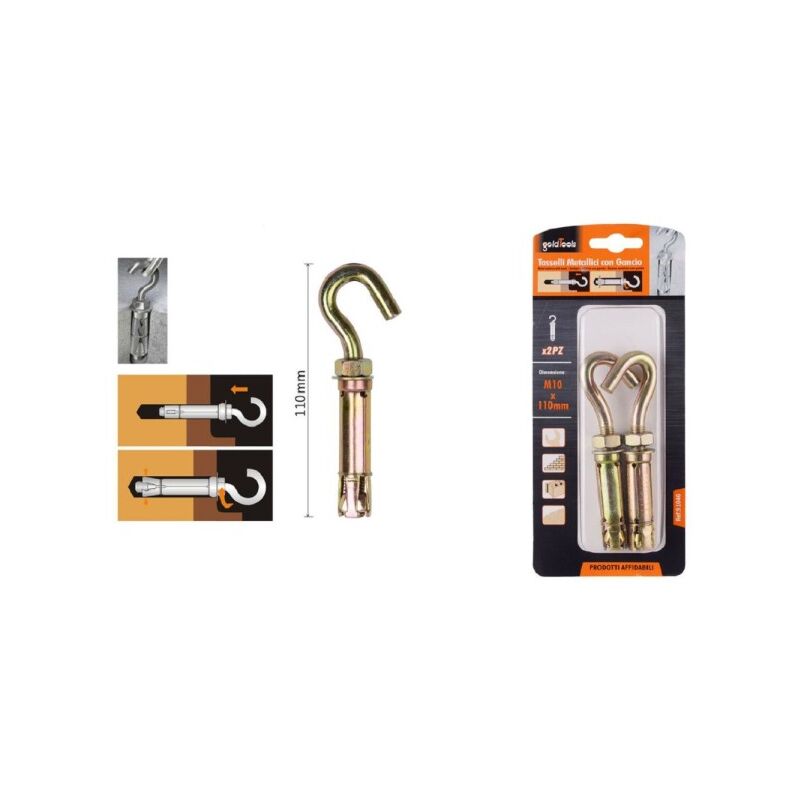 Set 2 pezzi tasselli metallici con gancioQuesto fornisce un fissaggio resistente a carichi elevati nei mattoni pieni e nel calcestruzzo. Utilizza la coppia per aumentare la resistenza del raccordo con la forza di rotazione. Il design dell'ancoraggio con schermatura a bullone allentato utilizza una testa a gancio, che consente all'acciaio di sopportare sollecitazioni elevate.Caratteristiche dimensione M10x110mm