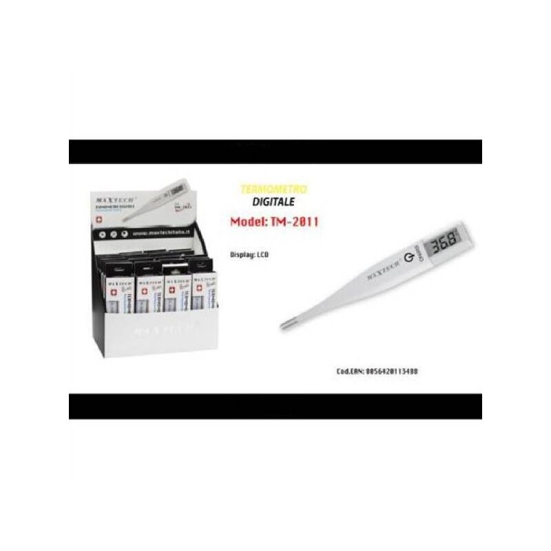 TERMOMETRO DIGITALE DISPLAY LCD TEMPERATURA VELOCE BAMBINO ADULTO TM-2011 MAXTECHIl termometro digitale TM-2011 di MAXTECH è un dispositivo all'avanguardia progettato per misurare con precisione la temperatura corporea. Dotato di un display LCD chiaro e luminoso, questo termometro offre una chiara visualizzazione dei risultati, rendendo facile la lettura anche in condizioni di scarsa illuminazione.CARATTERISTICHE PRINCIPALI:Display LCD: Il termometro è dotato di un display LCD di alta qualità che visualizza chiaramente la temperatura misurata.Misurazione Veloce: Grazie alla sua tecnologia avanzata, il TM-2011 offre una rapida lettura della temperatura corporea, consentendo una valutazione immediata dello stato di salute.Funzione Swing: Questo termometro è dotato di una funzione swing che permette una misurazione più precisa e confortevole, riducendo al minimo il rischio di errore.Adatto a Bambini e Adulti: Grazie alla sua velocità e precisione, il termometro TM-2011 è adatto sia ai