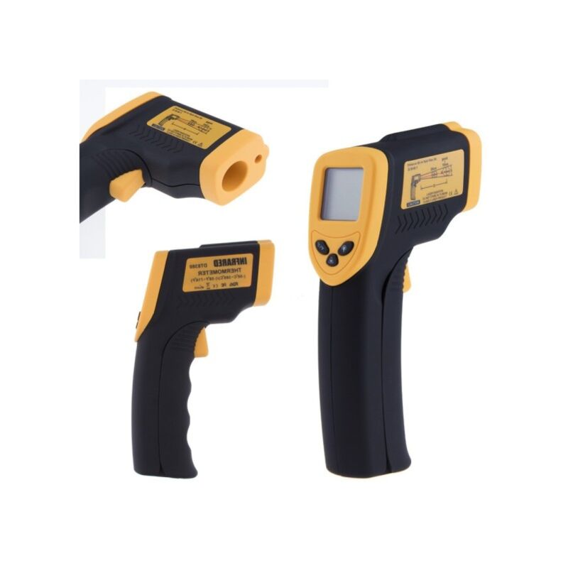 TERMOMETRO DIGITALE AD INFRAROSSI Nuovissimo oggetto che vi permetterà di misurare la temperatura di quasiasi superfice rimanendo distanti ed evitando il contatto con la stessa. Tutto questo è possibile grazie alla tecnologia ad infrarossi di cui questo termometro è dotato. Il termometro è molto semplice da usare: basta puntarlo sulla superfice di cui si vuole misurare la temperatura e premere il grilletto, verrà emesso un raggio laser che segnala il punto della misurazione e la temperatura sarà mostrata sul display. Sul display retroilluminato verrà visualizzata la temperatura dell'oggetto puntato ed una volta lasciato il grilletto, essa resterà memorizzata fino alla prossima pressione. Il display oltre a mostrare la temperatura indica l'attivazione del raggio laser e la necessità di sostituire la batteria. La semplicità di utilizzo è data dal fatto che questo splendido termometro presenta solo tre tasti(oltre al grilletto per la misurazione) che servono per la selezione dell'unità