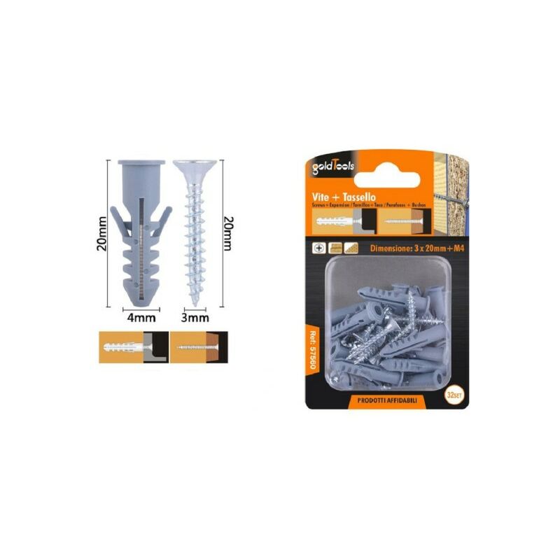 Set 32 pezzi tasselli M4 con viti ø 3x20 mmfissaggio con collare con corpo del tassello aperto e linguette antirotazione. L'espansione necessaria alla resistenza alla trazione avviene per avvitamento della apposita vite autofilettante e su due direzioni che permette, con espansioni parallele alla linea del bordo, di fissare carichi anche in prossimità degli spigoli. Il tassello, per la sua geometria, si fissa in profondità nel supporto e la presenza del collarino impedisce al tassello stesso di penetrare nel foro. Le sue alette laterali non gli permettono di ruotare sul proprio asse.Misure vite 3x20mm tassello M4 4x20mm