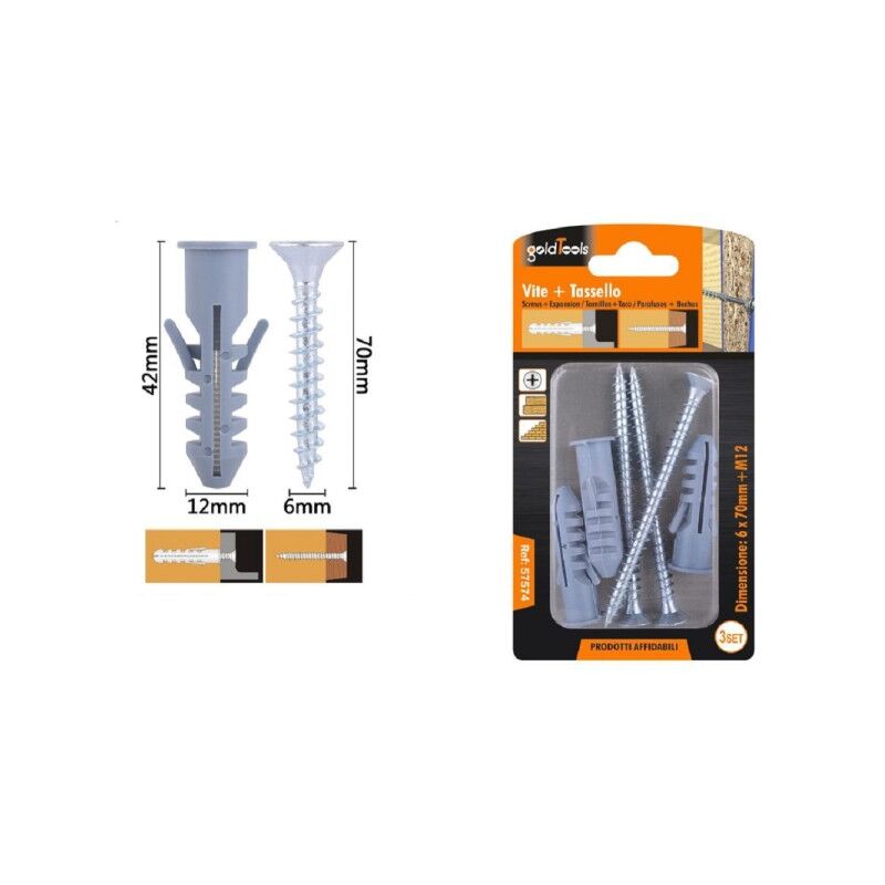 Set 3 pezzi tasselli M12 con viti ø 6x70mmfissaggio con collare con corpo del tassello aperto e linguette antirotazione. L'espansione necessaria alla resistenza alla trazione avviene per avvitamento della apposita vite autofilettante e su due direzioni che permette, con espansioni parallele alla linea del bordo, di fissare carichi anche in prossimità degli spigoli. Il tassello, per la sua geometria, si fissa in profondità nel supporto e la presenza del collarino impedisce al tassello stesso di penetrare nel foro. Le sue alette laterali non gli permettono di ruotare sul proprio asse.Misure vite 6x70mm tassello M12 12x42mm
