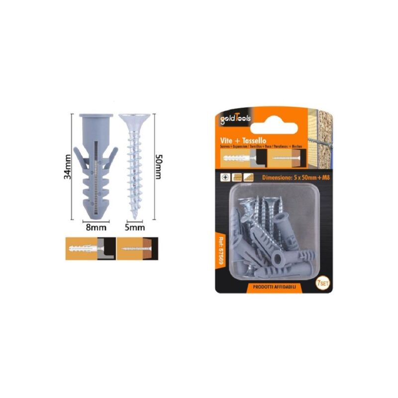 Set 7 pezzi tasselli M8 con viti ø 5x50 mmfissaggio con collare con corpo del tassello aperto e linguette antirotazione. L'espansione necessaria alla resistenza alla trazione avviene per avvitamento della apposita vite autofilettante e su due direzioni che permette, con espansioni parallele alla linea del bordo, di fissare carichi anche in prossimità degli spigoli. Il tassello, per la sua geometria, si fissa in profondità nel supporto e la presenza del collarino impedisce al tassello stesso di penetrare nel foro. Le sue alette laterali non gli permettono di ruotare sul proprio asse.Misure vite 5x50mm tassello M8 8x34mm