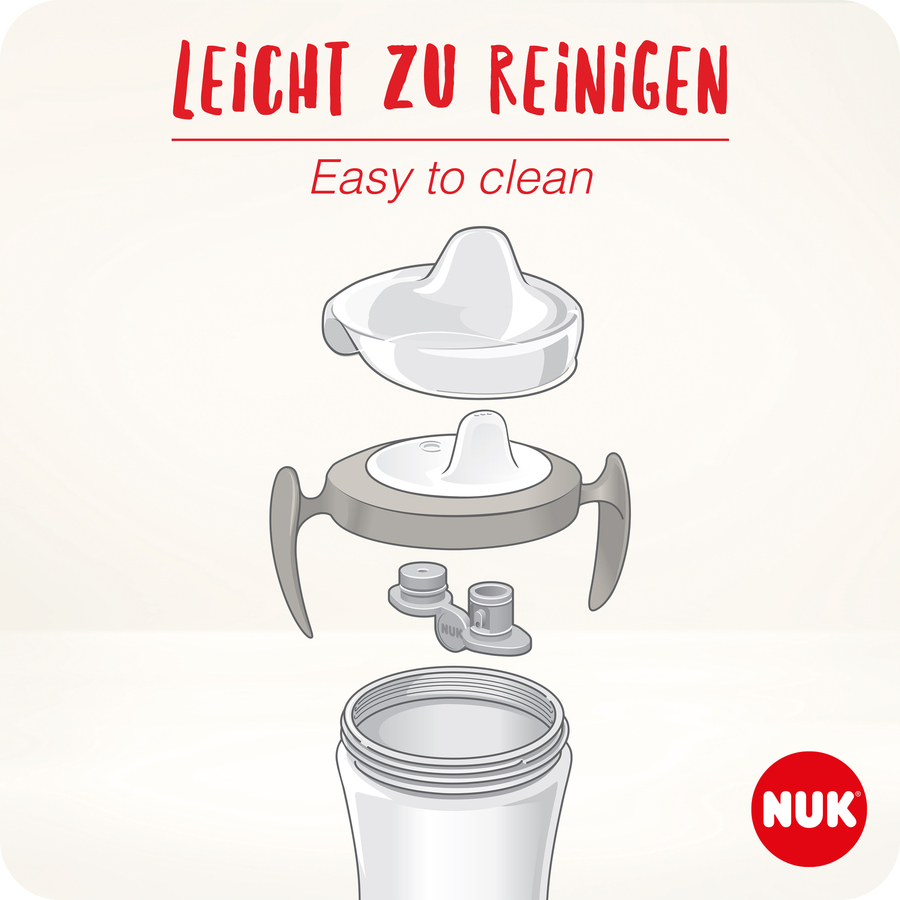 NUK Trainer Cup: imparare a bere è facile Il NUK Trainer Cup rende la transizione dal biberon alla tazza più facile per il tuo bambino. Il beccuccio morbido è particolarmente delicato sul palato e sulle gengive. Con l'aiuto dei manici ergonomici, il vostro bambino può facilmente tenere la tazza da solo. E per essere sicuri che non ci siano fuoriuscite, la NUK Trainer Cup è ovviamente a prova di perdite al 100%. Un coperchio aggiuntivo assicura che la tazza possa essere trasportata in modo pulito e sicuro, così puoi portarla con te ovunque tu vada. NUK Trainer Cup - ferma al tatto, delicata in bocca La tazza è fatta di materiale robusto e di alta qualità, 100% senza BPA e stampata con motivi carini. Si compone di pochissime parti individuali che possono essere smontate e riassemblate in pochissimo tempo. Inoltre, tutte le parti sono facili ed efficaci da pulire, in modo da avere più tempo per le cose più importanti. Quattro scelte - impara a bere come ti piace Evviva - stiamo imparando a bere! Il bere indipendente è uno dei passi più importanti nello sviluppo del tuo bambino - e abbastanza difficile. I piccoli hanno bisogno di molta pazienza e abilità. Vogliamo aiutarli a imparare e abbiamo sviluppato le tazze NUK Evolution per questo scopo: Tazze per bere che crescono con il tuo bambino, in due misure e con diversi attacchi per bere. Dettagli del prodotto: Età: da 6 mesi Design: rosa Capacità di riempimento: 230 ml Beccuccio morbido, particolarmente delicato sul palato e sulle gengive A prova di perdite Con tappo di protezione per gli spostamenti Materiale: polipropilene (PP) Maniglie ergonomiche - facili da tenere per le mani piccole BPA-free NUK Le tazze sono conformi alla norma di sicurezza europea EN14350. Leggere attentamente le avvertenze e le istruzioni per l'uso all'interno. Si prega di conservare le informazioni sul prodotto e il numero di articolo/lotto per un uso successivo. NUK Le tazze e gli accessori per bere possono essere combinati solo con la rispet