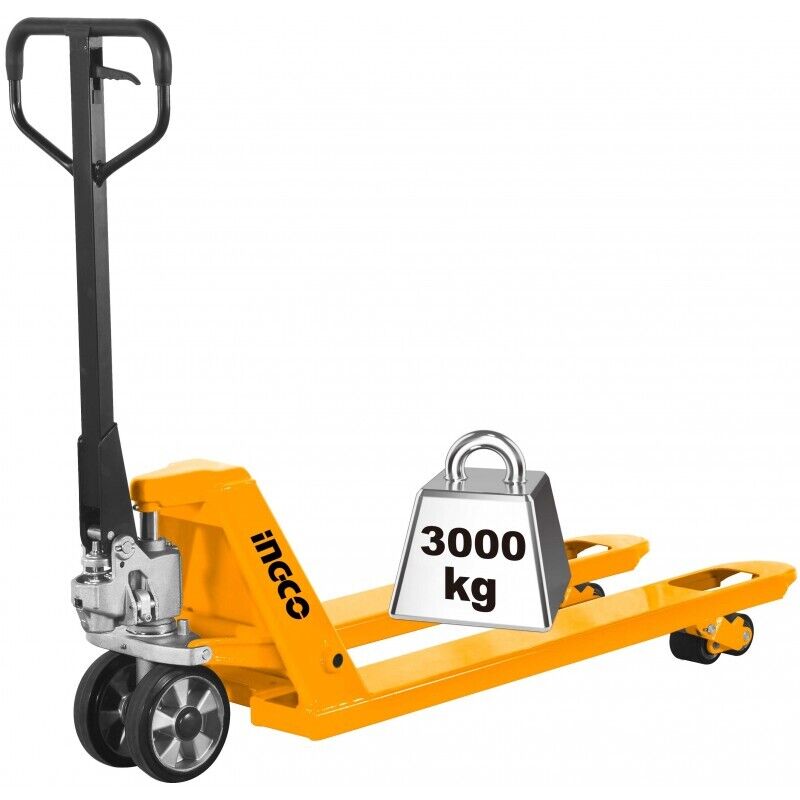 TRANSPALLET 3,0T "INGCO" Carico max.: 3000kg Altezza min.:85mm Altezza max.:200mm Ruota: Ø200x50mm Materiale ruota: poliuretano Ruota rullo di carico: Ø80x70mm Misura forcella: 540x1150mm Comoda impugnatura in gomma