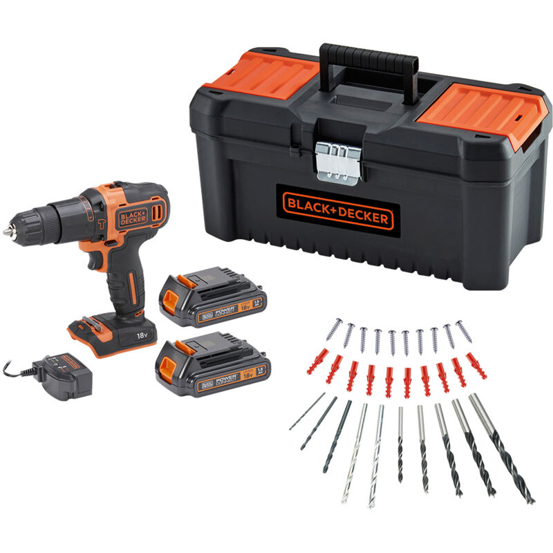 Mod. BDCHD18C2TA. avvitatore con batteria al litio 18V. Numero giri a vuoto 0 - 360/0 - 1.400 giri/min. Colpi al minuto 21.000. Capacita' massima mandrino autoserrante 10 mm. Coppia di serraggio 17.5/40 Nm. Max capacità di foratura legno 25 mm. Max capacità di foratura acciaio 10 mm. Max capacità di foratura muratura 10 mm. 11 punti di regolazione coppia di serraggio + azione a percussione. Luce LED per illuminare l'area di lavoro. Contenuto valigetta: 2 batterie Litio 18V - 1.5Ah. Caricabatterie (ricarica 3-5h). Inserto a doppia funzione. Set 10 accessori + 10 tasselli + 10 viti.