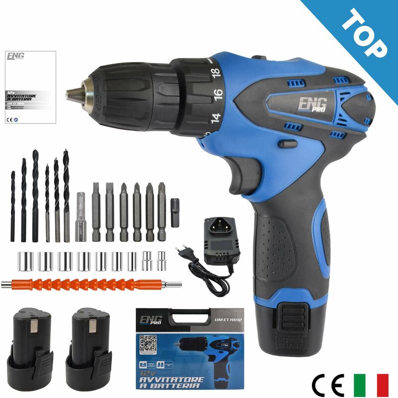 Trapano avvitatore a batteria 12V - ENG PRO - UM ET AB12 Il trapano avvitatore ENG PRO è lo strumento ideale per professionisti e appassionati del fai da te. Questo trapano avvitatore è confezionato in una robusta valigetta di plastica ed è equipaggiato con un potente motore alimentato da una batteria da 12V. Il motore offre la potenza necessaria per una vasta gamma di applicazioni e può essere facilmente modulato grazie alla frizione a ruota. La presenza di una luce LED integrata rende il lavoro più agevole anche in condizioni di scarsa visibilità. Il trapano avvitatore è dotato di un pulsante bidirezionale per invertire la direzione di rotazione del mandrino, mentre il pulsante della velocità consente di scegliere tra due diverse impostazioni di velocità. Inoltre, una comoda ruota di regolazione situata sul pulsante di azionamento permette di variare la velocità di rotazione del mandrino in modo preciso. Il mandrino autoserrante da 10 mm consente di cambiare rapidamente le punte in